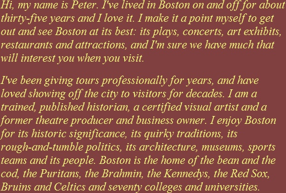 I love presenting Boston's history from the colonial era to recent times and I try to do so